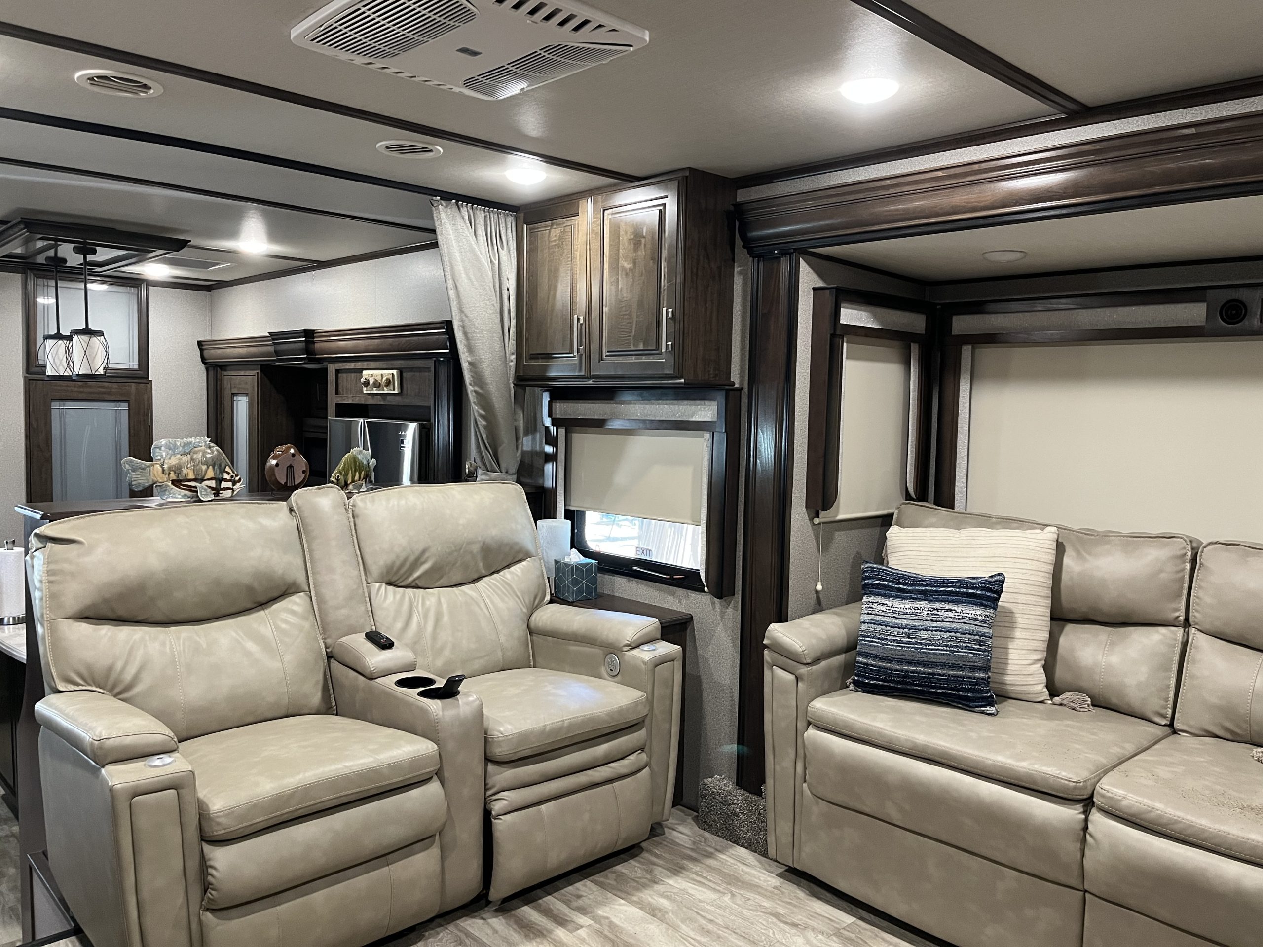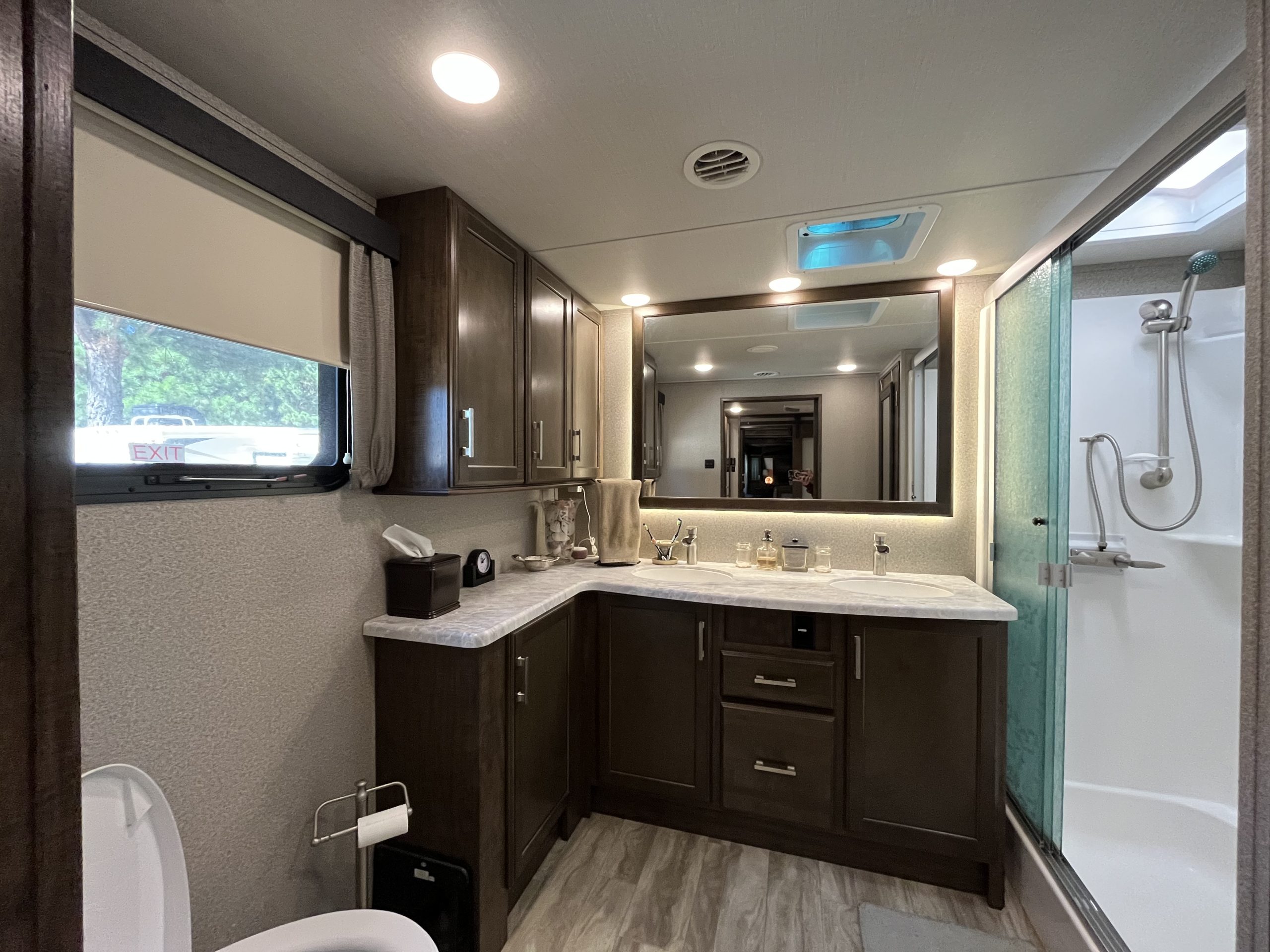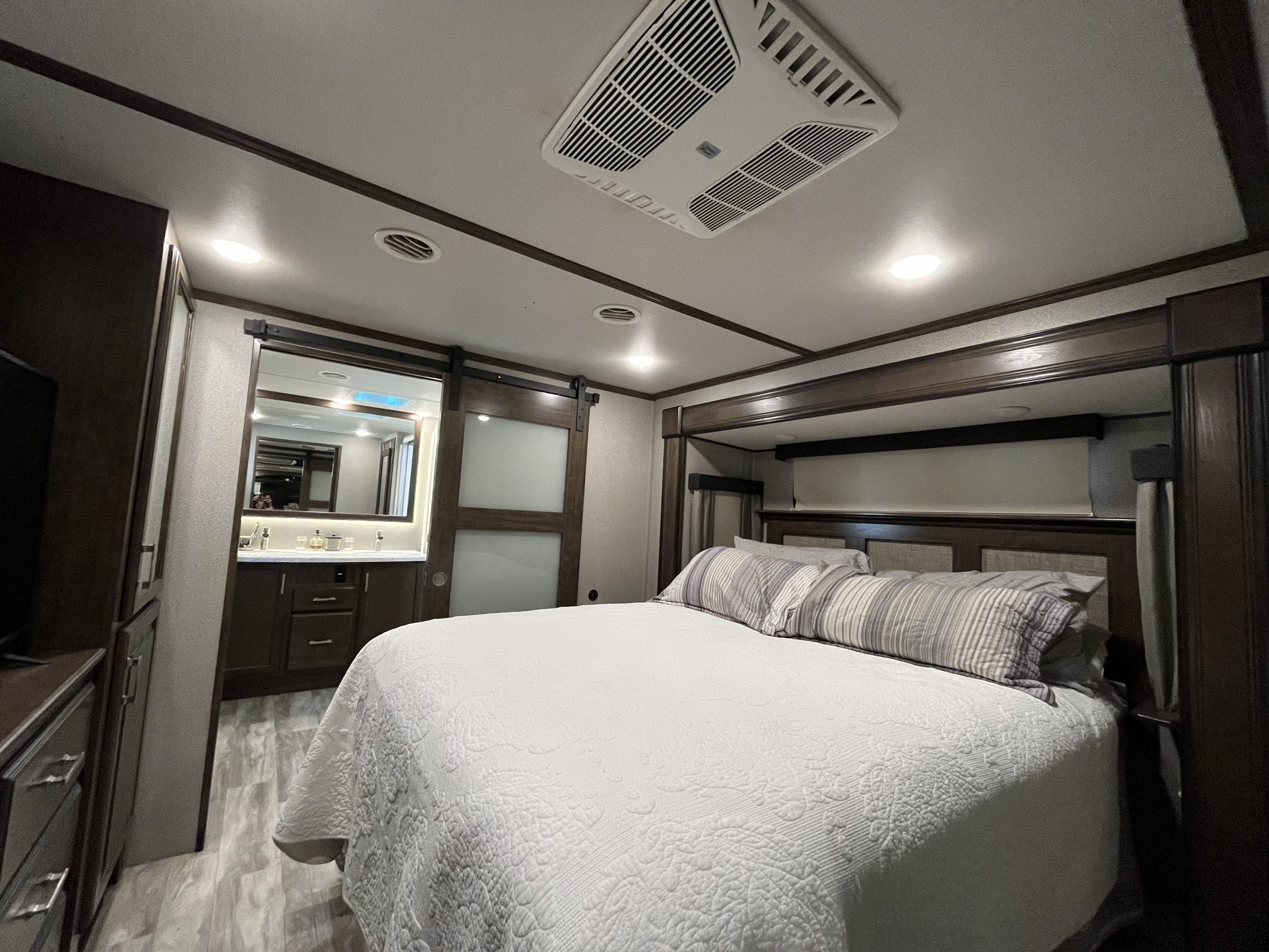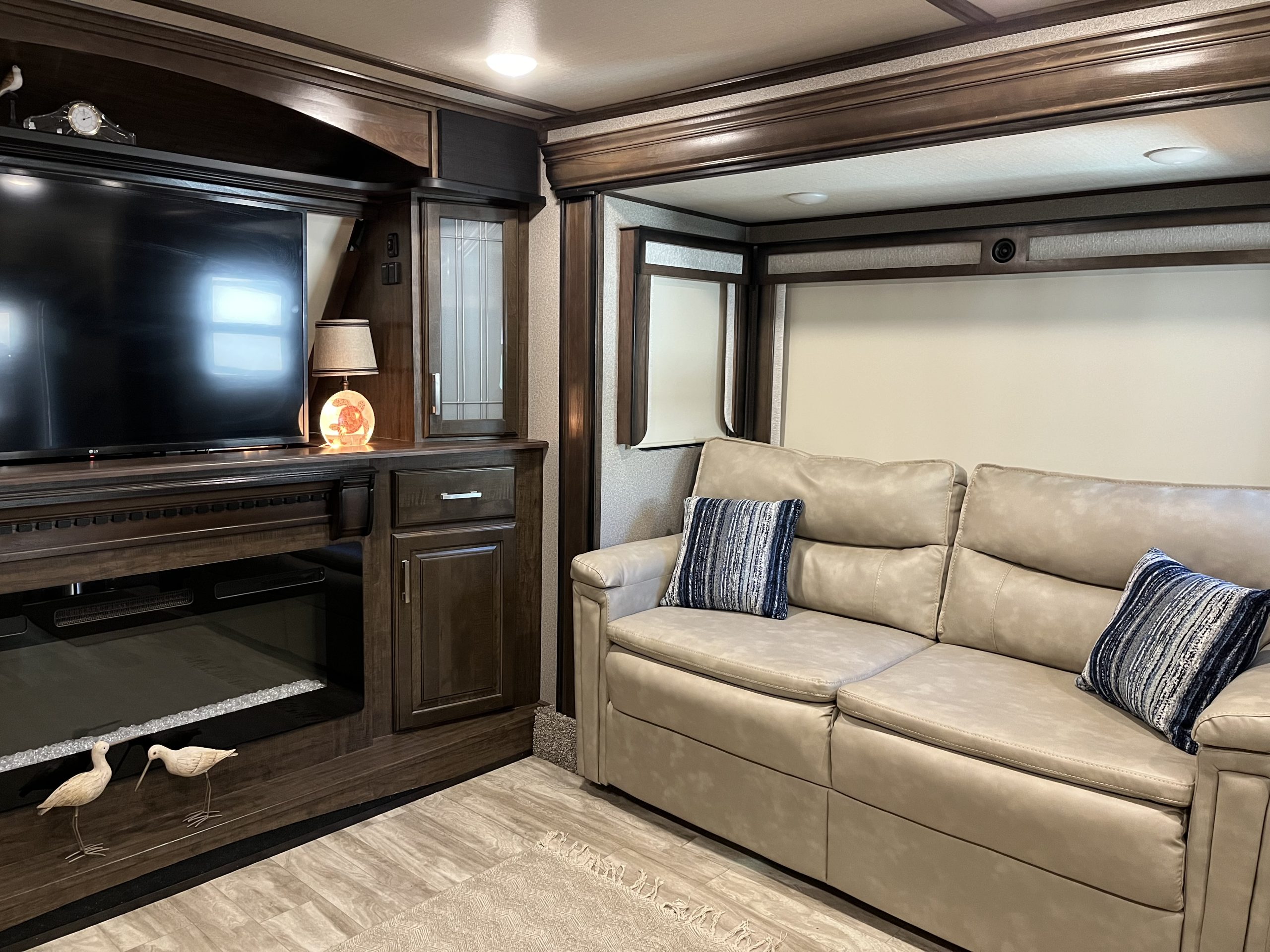 Featuring 1 bedroom and 1.5 bathrooms, this retreat is ideal for couples looking for comfort and space. The front living room creates the feel of a true home—not just an RV—with its generous seating and open layout. The master suite is a dream come true, offering abundant storage and a gorgeous ensuite bathroom designed with both style and functionality in mind.