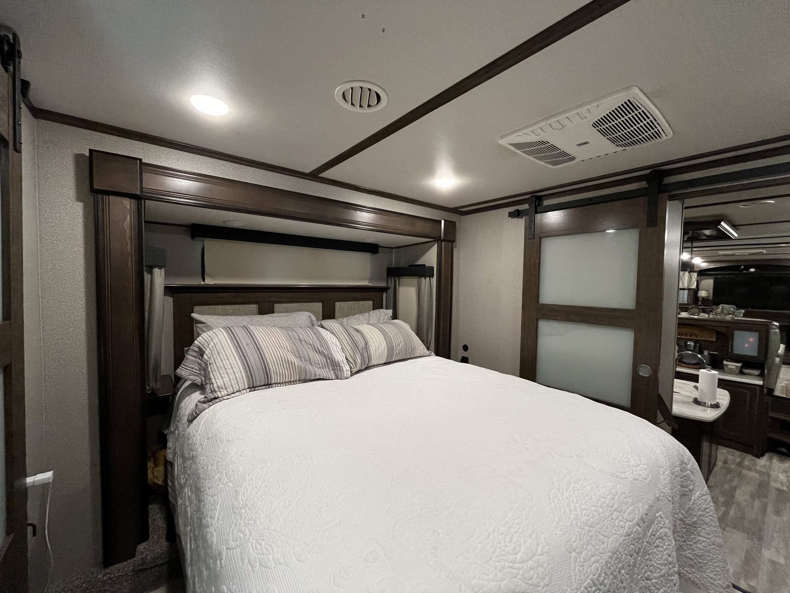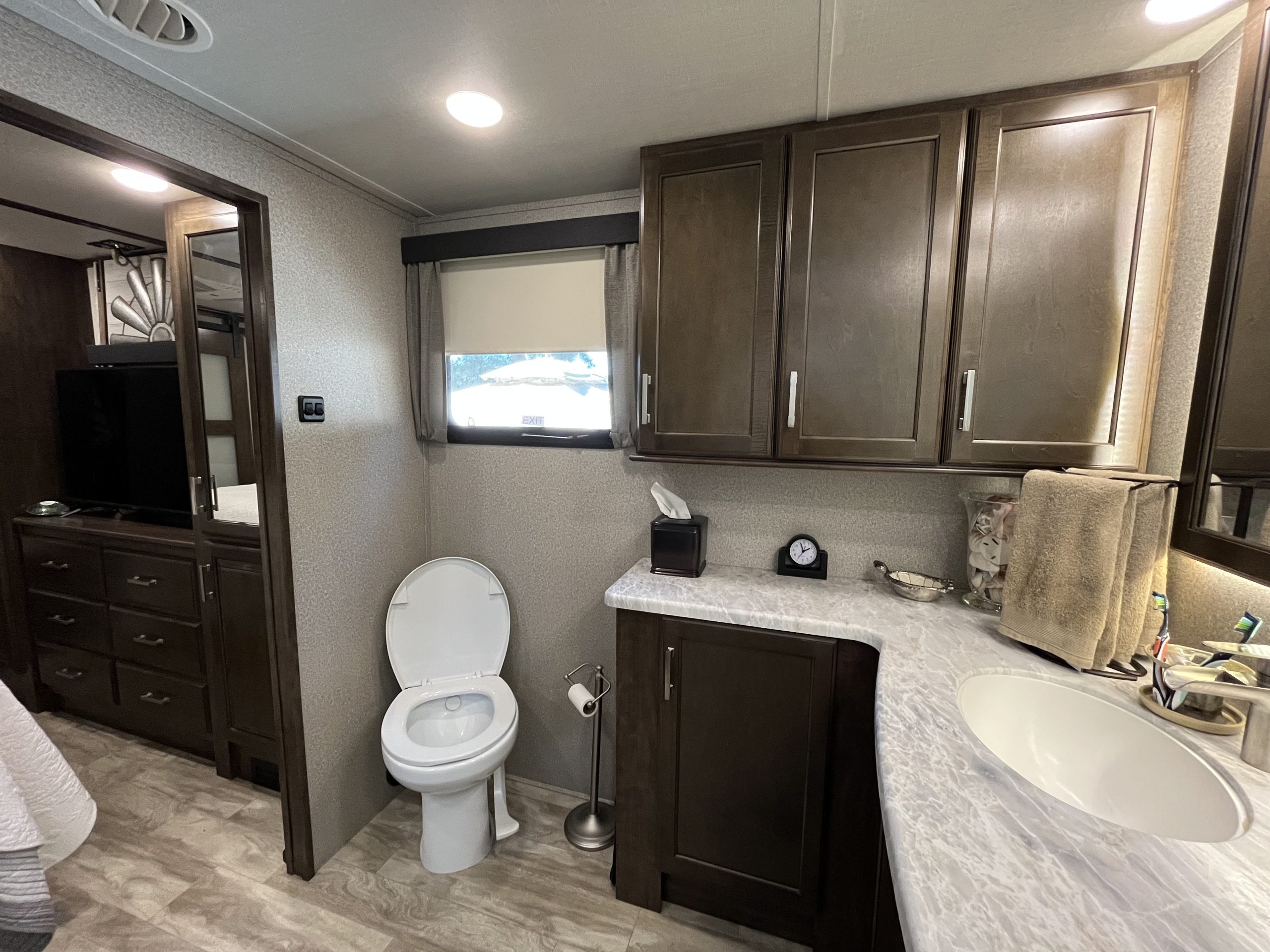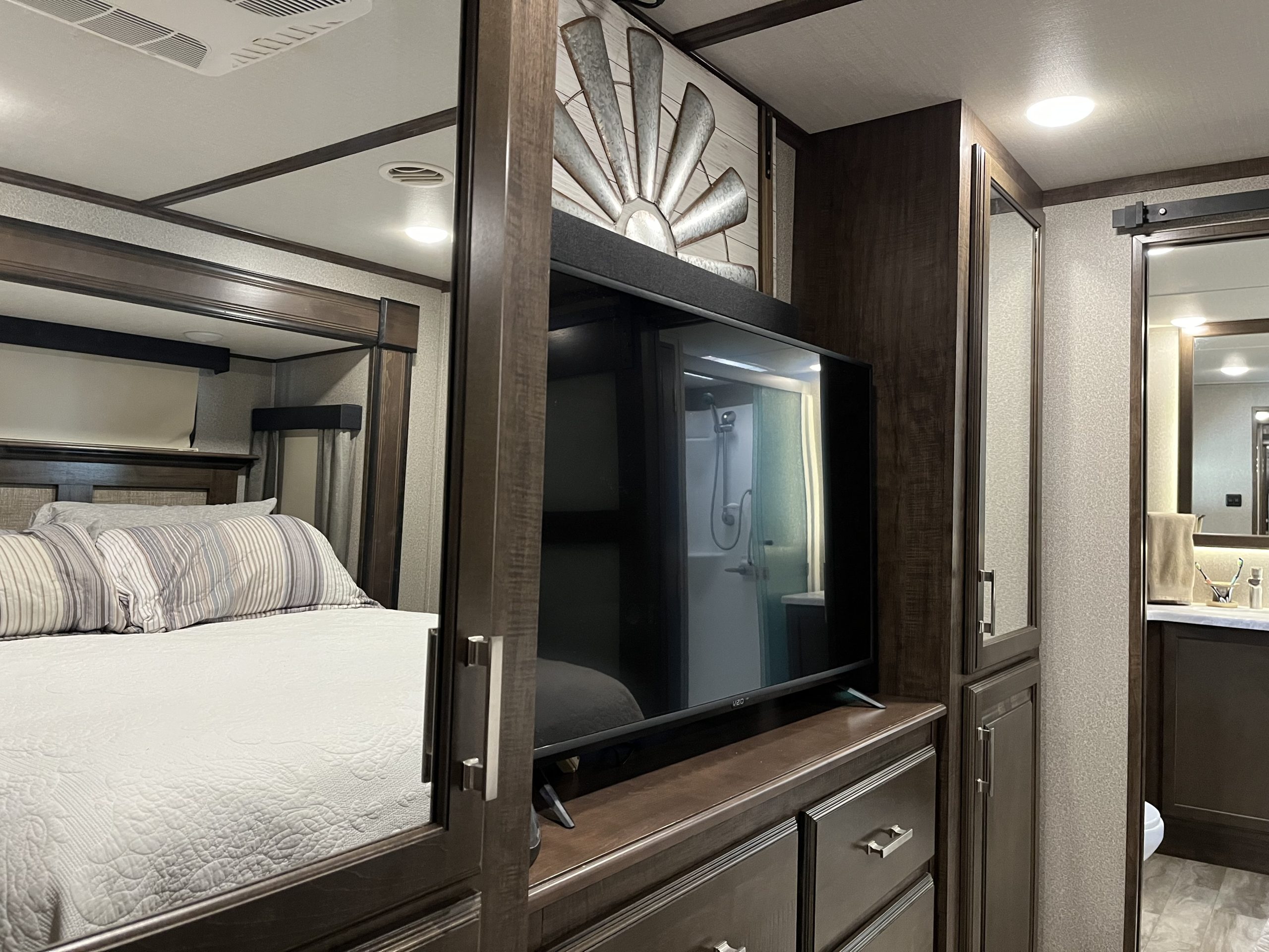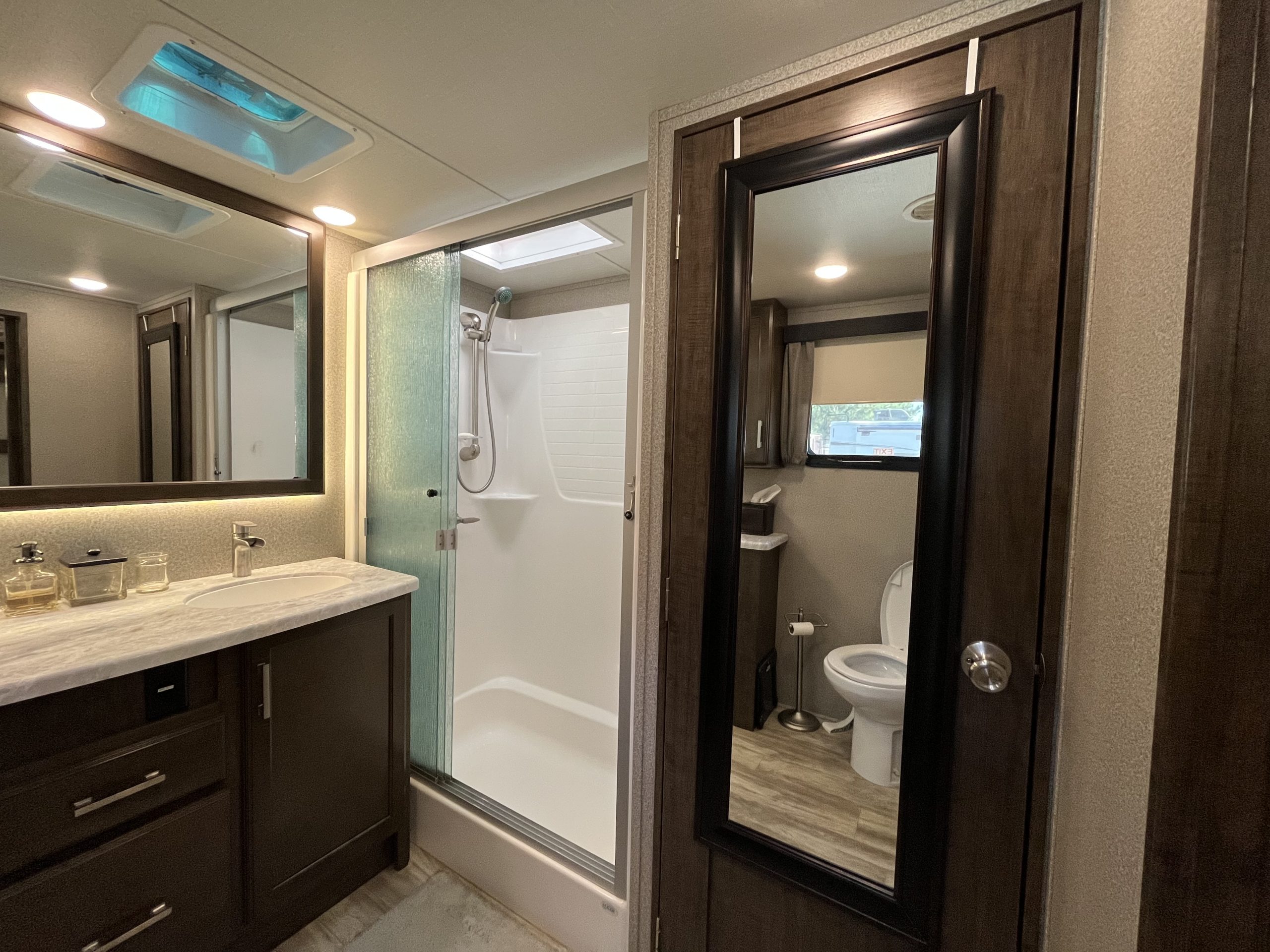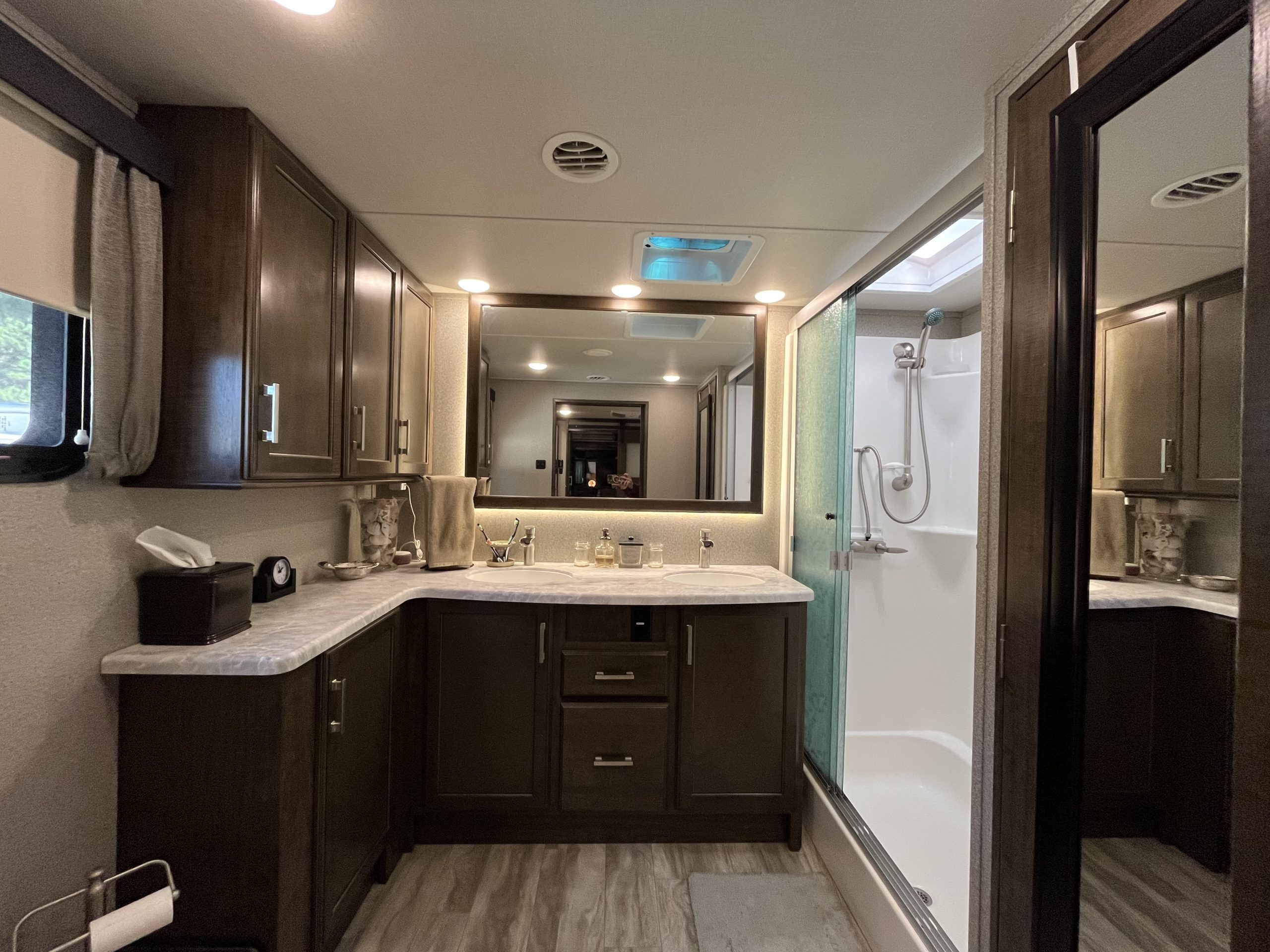 Featuring 1 bedroom and 1.5 bathrooms, this retreat is ideal for couples looking for comfort and space. The front living room creates the feel of a true home—not just an RV—with its generous seating and open layout. The master suite is a dream come true, offering abundant storage and a gorgeous ensuite bathroom designed with both style and functionality in mind.