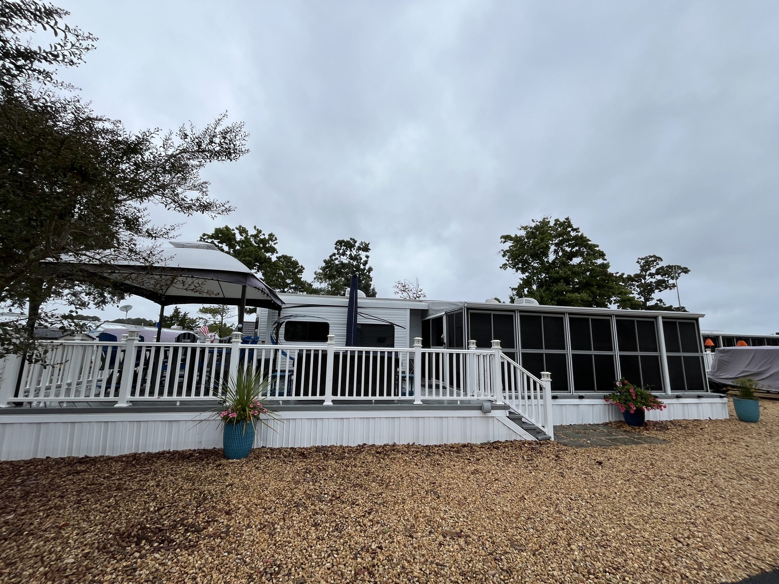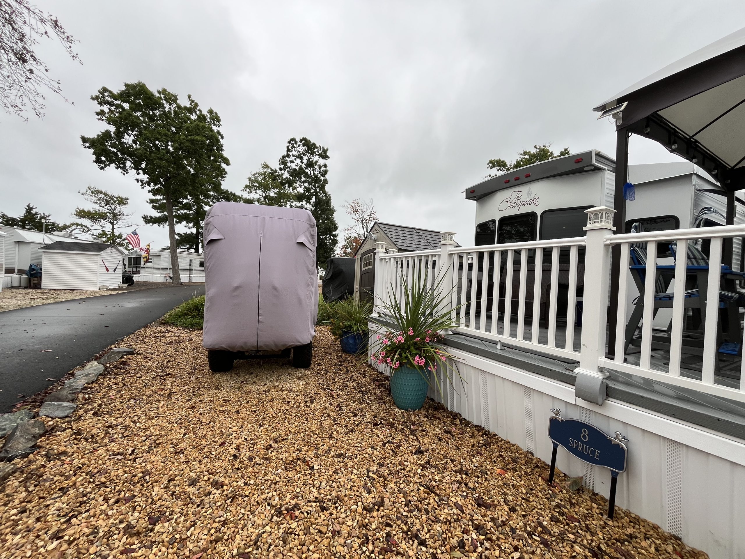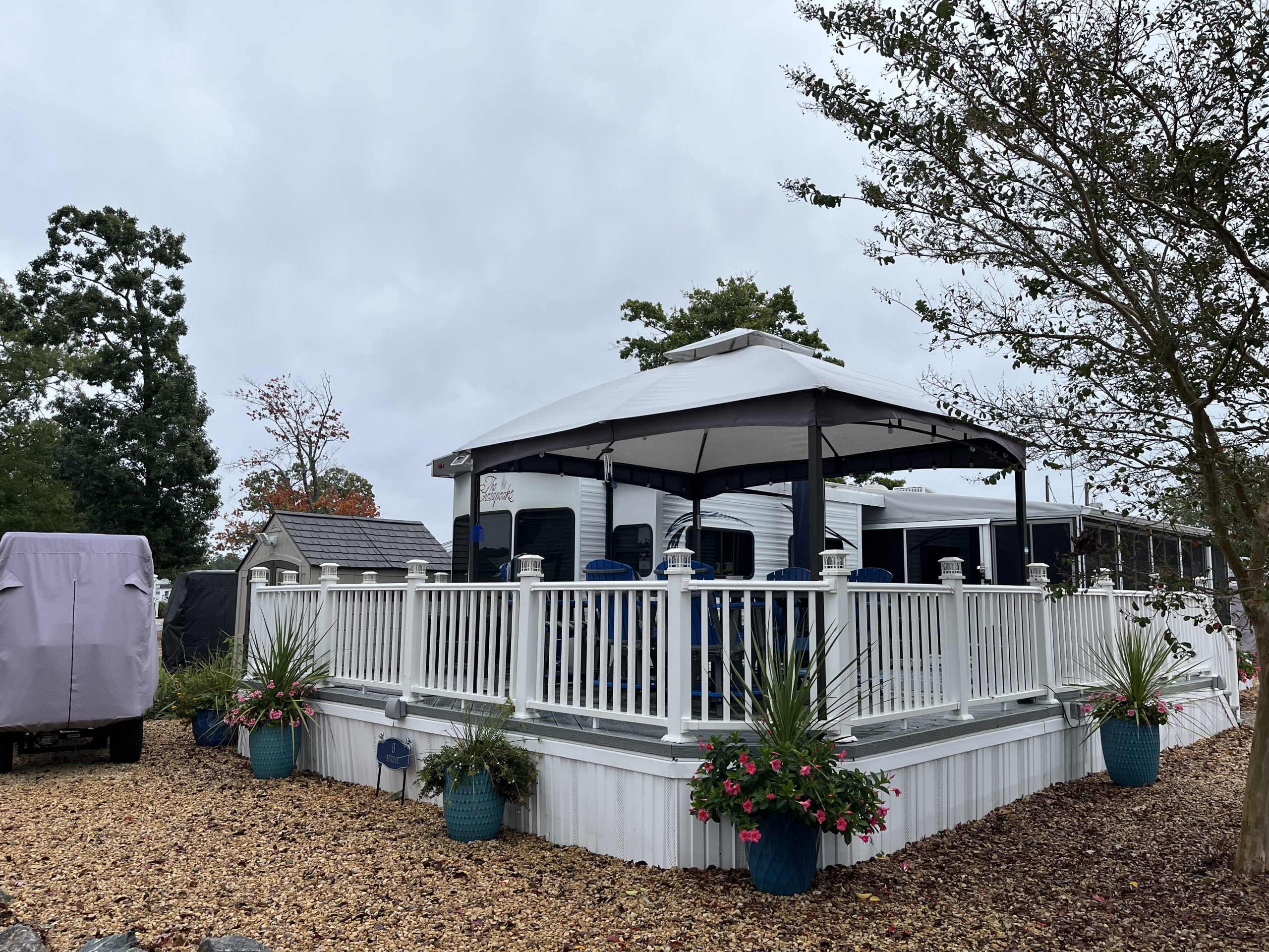Welcome to Spruce 08, featuring a beautifully maintained 2016 Hyline Park Model with an added screen room for extra living space. Situated on a large gravel corner lot in the desirable Point section of the resort, this property offers beautiful waterviews of Robinson Creek, which opens into the Rappahannock River — the perfect backdrop for stunning sunsets and that true “vacation life” feel.